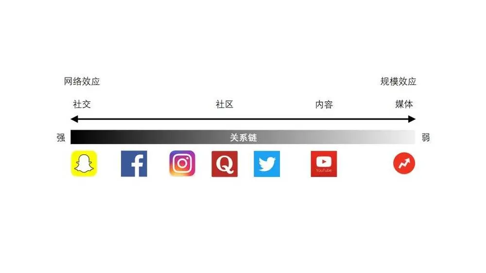 早期的Snapchat是最完全的社交通讯产品,FB是社交网络,而从Instagram、Quora到Twitter更多的是属于Social Media
