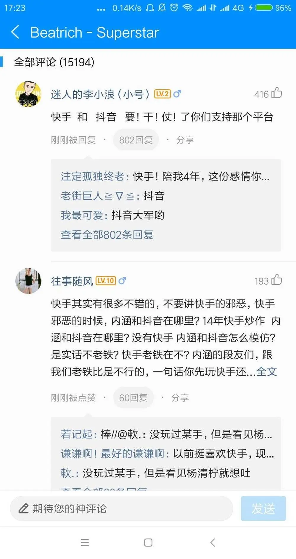 这种表现不仅呈现在数据上,在其它一些意想不到的地方也有反映。比如这首叫“Superstar”的歌是抖音神曲,而快手上也有这首歌的内容。如果你到酷狗音乐上去搜这首歌,你会发现抖音和快手的用户在酷狗的评论区掐起来了