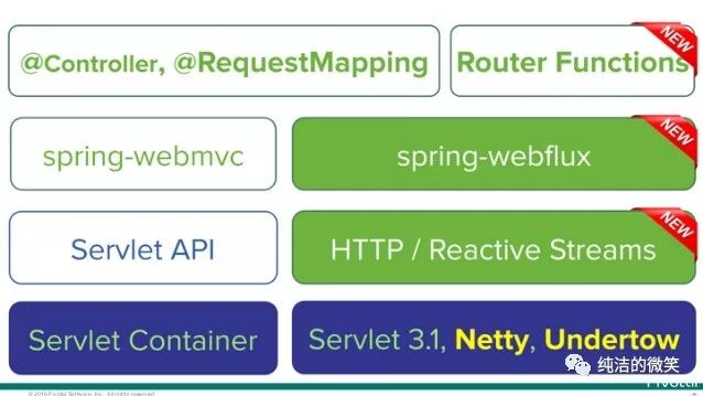 WebFlux 模块的名称是 spring-webflux,名称中的 Flux 来源于 Reactor 中的类 Flux。Spring webflux 有一个全新的非堵塞的函数式 Reactive Web 框架,可以用来构建异步的、非堵塞的、事件驱动的服务,在伸缩性方面表现非常好。