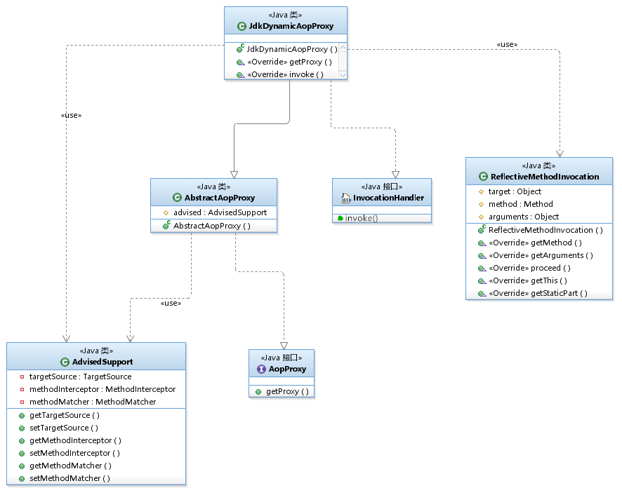 我们称被代理对象为TargetSource,而AdvisedSupport就是保存TargetSource和MethodInterceptor的元数据对象。这一步我们先实现一个基于JDK动态代理的JdkDynamicAopProxy,它可以对接口进行代理。于是我们就有了基本的织入功能。