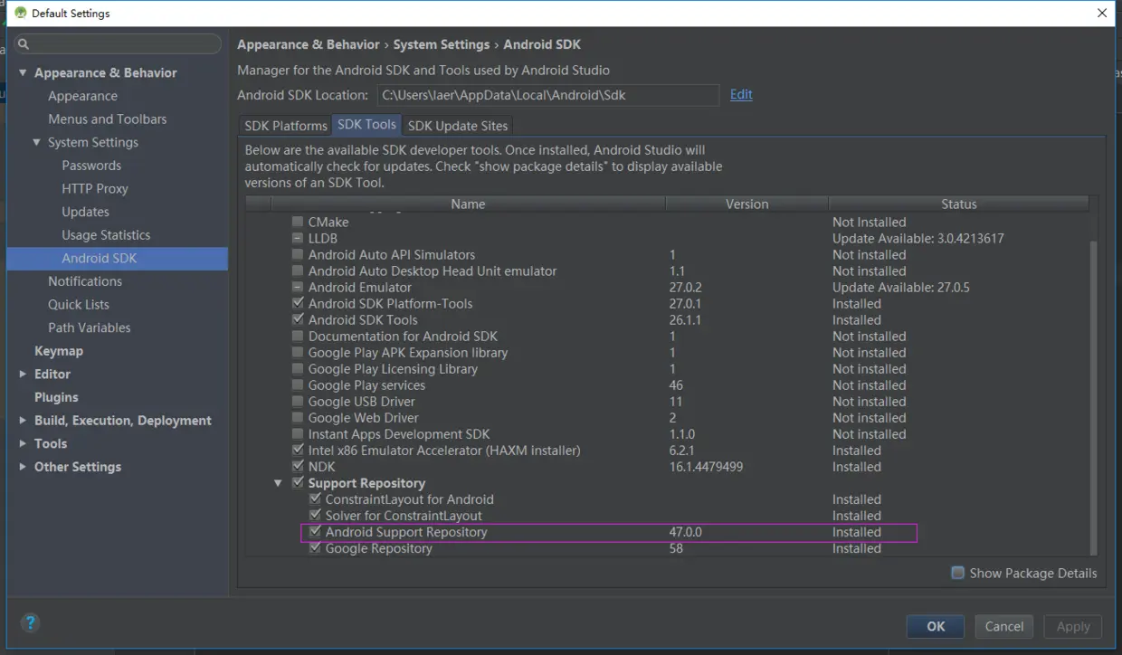 然后进入SDKManager(可通过Android Studio菜单Tools-Android-SDK Manager),确保以下项目已经安装并更新到最新:
