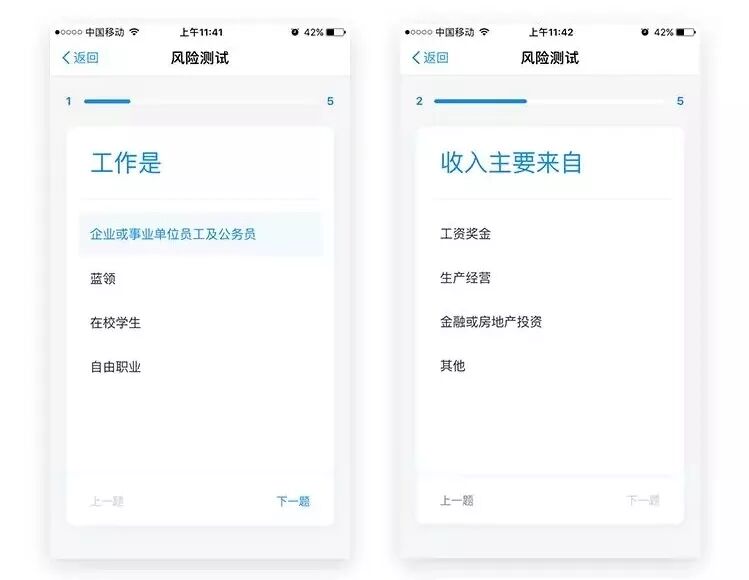 首次在蚂蚁财富理财时,金融机构都会强制要求用户做一次风险测评,这时候希克定律就不适用了,因为每道题都需要仔细的阅读和思考才能作答,希克定律不适用于这类需要高度阅读与解答问题的工作。但是设计师还是有办法让风险测评看起来更友好,设计师将每道试题拆分成一个界面,这样就会让用户在一个页面上的目标更加专注,选择更少。头部的进度条让用户时刻了解自己所处的位置。