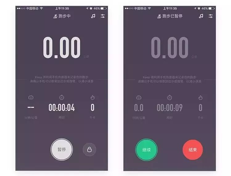 △ keep跑步中界面和跑步暂停界面