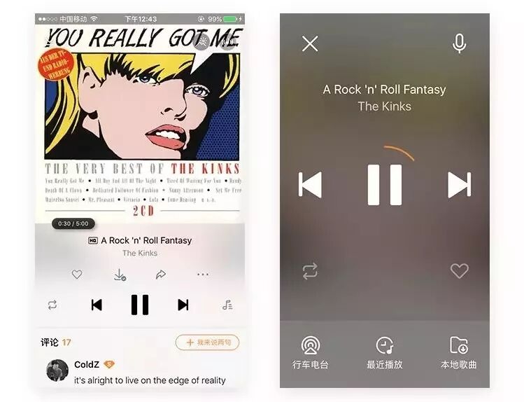 △ 虾米播放器界面和虾米驾驶模式播放器界面