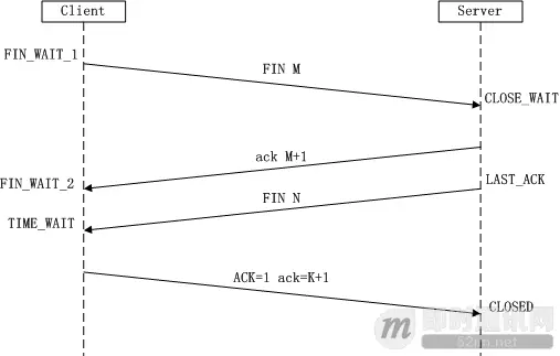 Server收到FIN后,发送一个ACK给Client,确认序号为收到序号+1(与SYN相同,一个FIN占用一个序号),Server进入CLOSE_WAIT状态。
