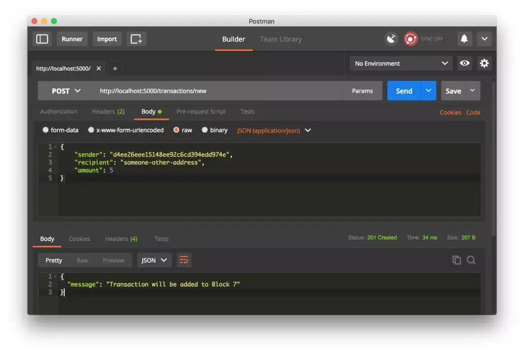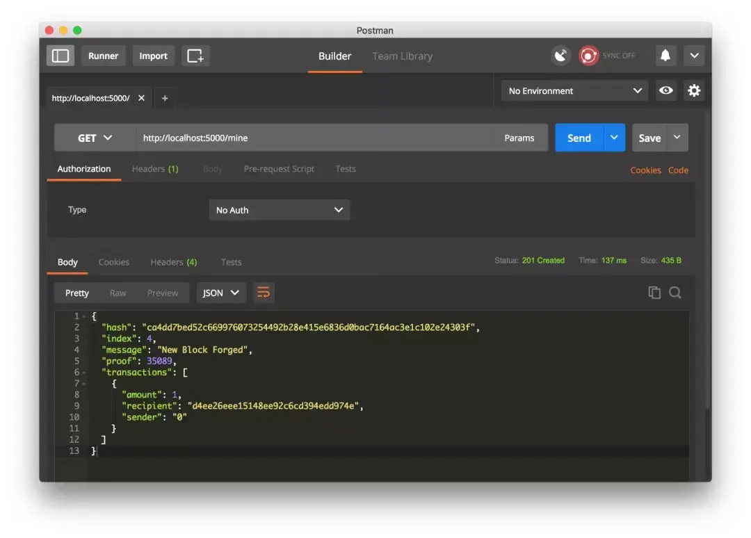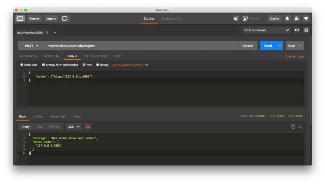 你可以在不同的机器运行节点,或在一台机机开启不同的网络端口来模拟多节点的网络,这里在同一台机器开启不同的端口演示,在不同的终端运行一下命令,就启动了两个节点:http://localhost:5000 和 http://localhost:5001