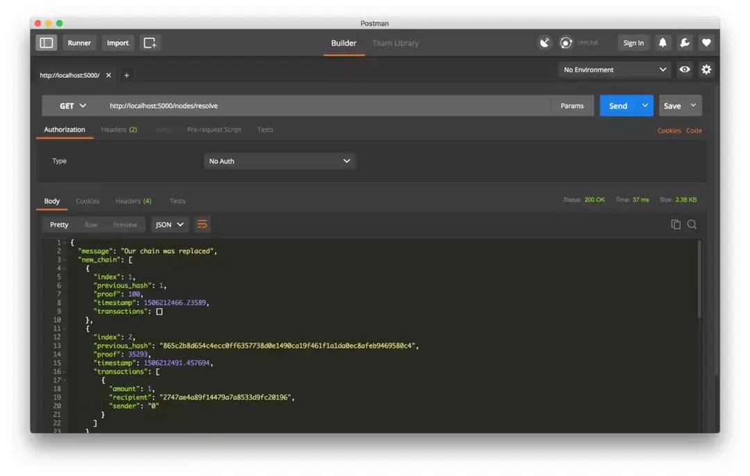 然后在节点2上挖两个块,确保是更长的链,然后在节点1上访问接口/nodes/resolve ,这时节点1的链会通过共识算法被节点2的链取代。