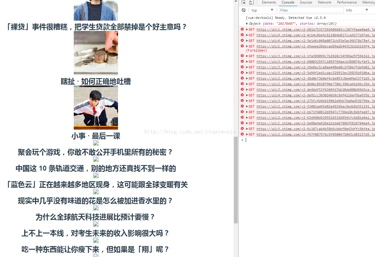 <template> <div> <ul> <li v-for="item in articles"> <h2>{{item.title}}</h2> <img :src="item.images" alt=""> </li> </ul> </div> </template> <script> import axios from 'axios'; export default{ data(){ return { articles : [] } }, mounted(){ // 缓存指针 let _this = this; // 设置一个开关来避免重负请求数据 let sw = true; // 此处使用node做了代理 axios.get('http://localhost:3000/proxy?url=http://news-at.zhihu.com/api/4/news/latest') .then(function(response){ // console.log(JSON.parse(response.data).stories); // 将得到的数据放到vue中的data _this.articles = JSON.parse(response.data).stories; }) .catch(function(error){ console.log(error); }); // 注册scroll事件并监听 window.addEventListener('scroll',function(){ // console.log(document.documentElement.clientHeight+'-----------'+window.innerHeight); // 可视区域高度 // console.log(document.body.scrollTop); // 滚动高度 // console.log(document.body.offsetHeight); // 文档高度 // 判断是否滚动到底部 if(document.body.scrollTop + window.innerHeight >= document.body.offsetHeight) { // console.log(sw); // 如果开关打开则加载数据 if(sw==true){ // 将开关关闭 sw = false; axios.get('http://localhost:3000/proxy?url=http://news.at.zhihu.com/api/4/news/before/20170608') .then(function(response){ console.log(JSON.parse(response.data)); // 将新获取的数据push到vue中的data,就会反应到视图中了 JSON.parse(response.data).stories.forEach(function(val,index){ _this.articles.push(val); // console.log(val); }); // 数据更新完毕,将开关打开 sw = true; }) .catch(function(error){ console.log(error); }); } } }); } } </script> <style lang="less"> *{ margin:0; padding:0; } li{ list-style:none; } </style> 大致效果如下:
