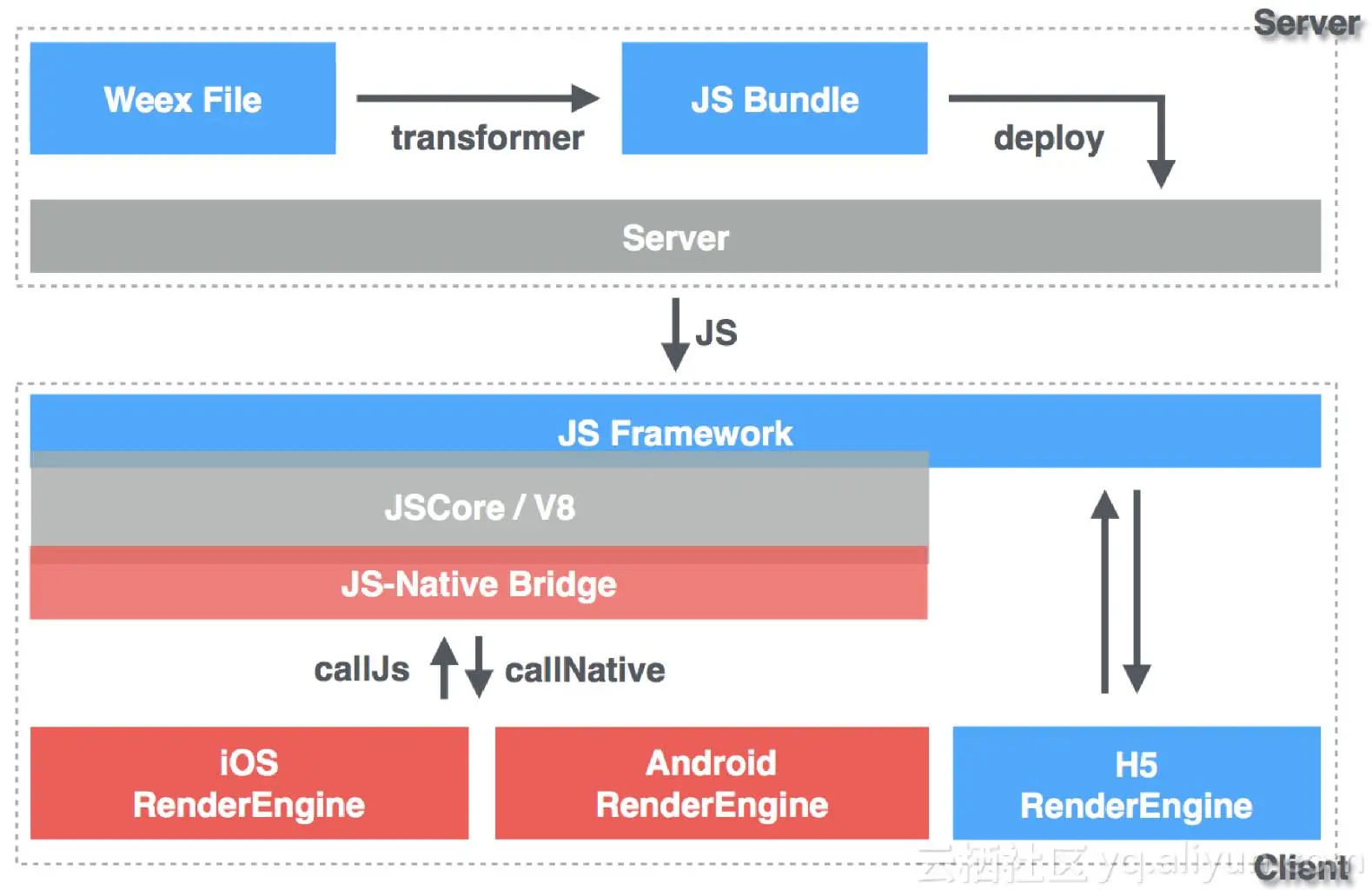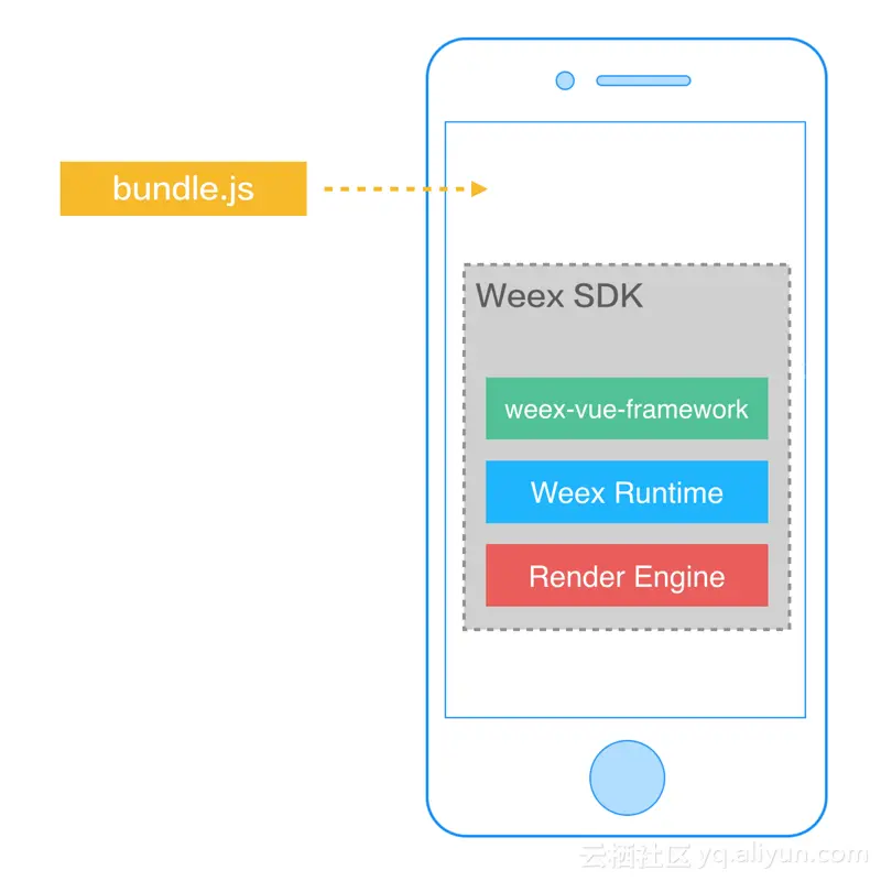 可以看到在JS-Native Bridge将渲染指令发送给Android或者iOS渲染引擎之前,我们的业务代码运行在JSCore/v8的执行引擎之中,而在该执行引擎之中除了执行业务JSBundle,还运行着JS Framework,JS Framework不仅提供了jsbundle必要的运行时环境,同时还提供了与native通信的接口。