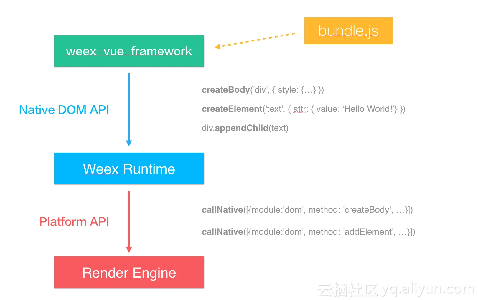 然而由于目标执行环境不同(浏览器和 Weex 容器),在渲染真实 UI 的时候调用的接口也不同。