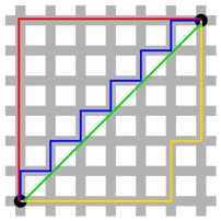 从名字就可以猜出这种距离的计算方法了。想象你在曼哈顿要从一个十字路口开车到另外一个十字路口,驾驶距离是两点间的直线距离吗?显然不是,除非你能穿越大楼。实际驾驶距离就是这个“曼哈顿距离”。而这也是曼哈顿距离名称的来源, 曼哈顿距离也称为城市街区距离(City Block distance)。