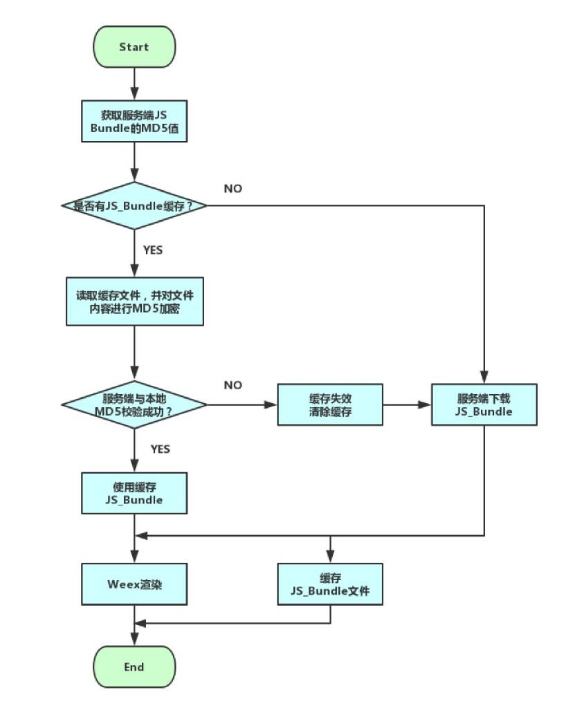 在拿到服务端JS的url后,首先判断是否有本地JS缓存,若有则对比本地JS及服务端JS的MD5进行校验,校验通过则直接使用本地JS,否则按原计划下载服务端JS。Weex支持使用本地JS文件。