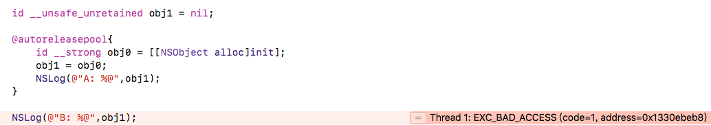 我们再换成**__unsafe_unretained**修饰符来进行一下比对.