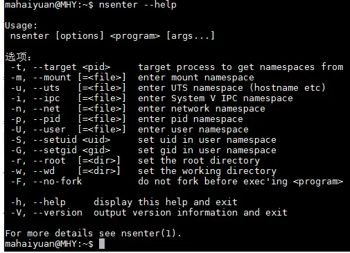 安装好nsenter之后可以查看一下该命令的使用。