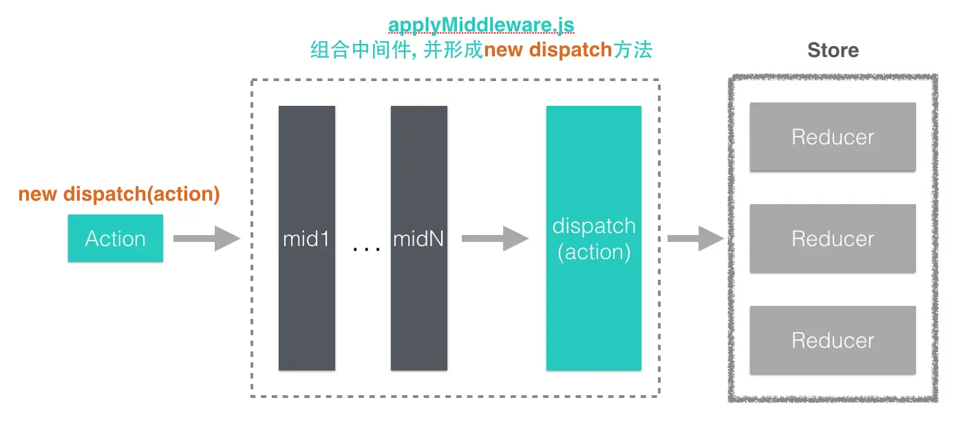 Redux中reducer更关注的是数据逻辑转化,所以Redux中间件是为了增强dispatch方法出现的。如我们上面图,所描述的流程。中间件调用链,会在dispatch(action)方法之前调用。