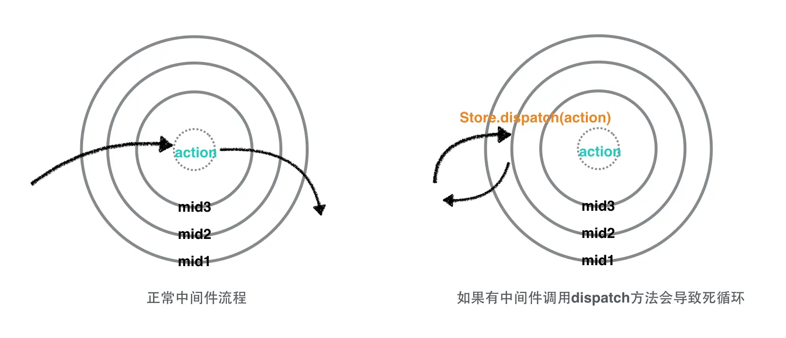 此时保存在各个中间件中的store.dispatch为已组合中间件dispatch方法,中间件如果调用dispatch方法,会发生死循环在调用链中。