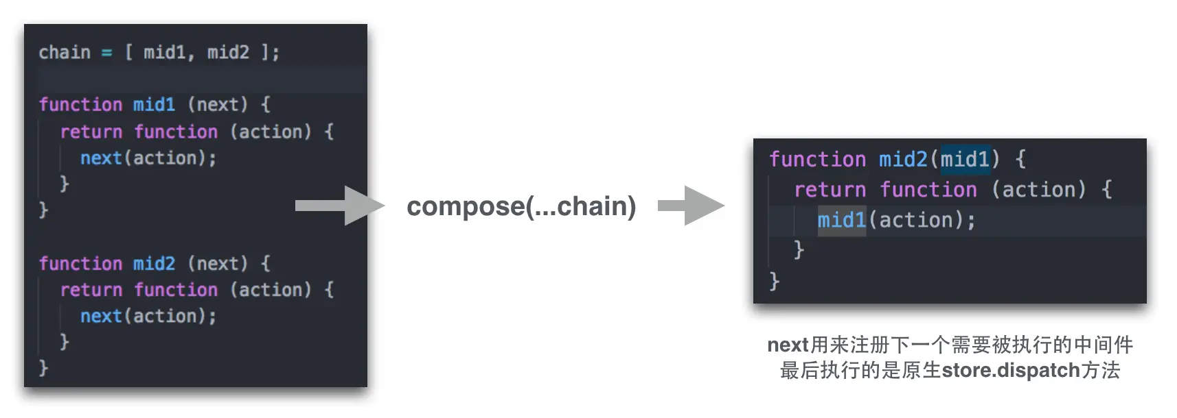 // compose(...chain)会形成一个调用链, next指代下一个函数的注册, 如果执行到了最后next就是原生的store.dispatch方法