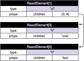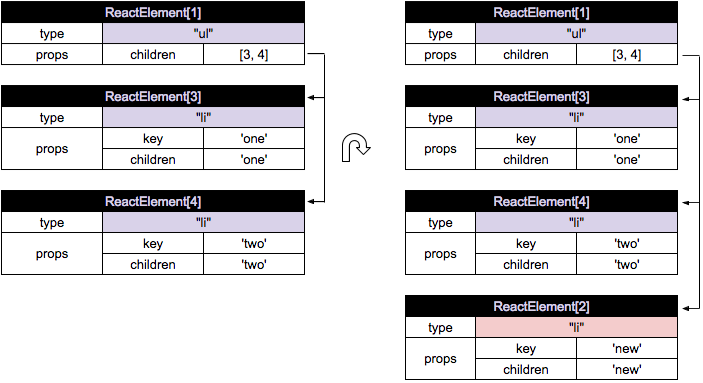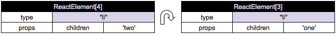 从而ReactReconciler.receiveComponent()的递归调用中不会对(key:one 和 two)生成任何实际的DOM操作, 因为它们的内容是相同的。所以这次唯一需要的DOM操作是
