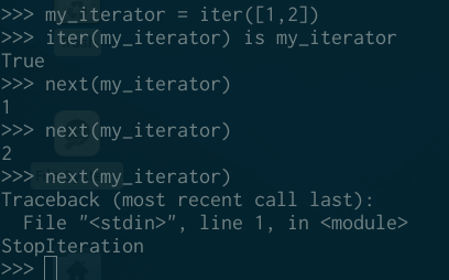 如果你可以循环多次而不用「耗尽」它,它不是一个迭代器。如果你不能将某些东西传递给 next 函数,那么它不是一个迭代器。 Python 3 的 range 对象不是迭代器。 如果你正在指导别人关于 range 对象的知识,请不要使用「迭代器」一词,这会让人十分困惑,并可能导致他人开始滥用「迭代器」这个词。