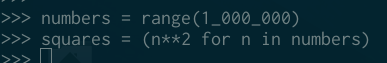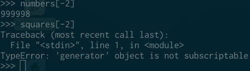 我经常说迭代器是惰性的一次性可迭代对象。 「惰性」是因为他们只循环计算项目,「单次使用是因为一旦从一个迭代器中「消费」了一个元素之后,这个元素就永远消失了。