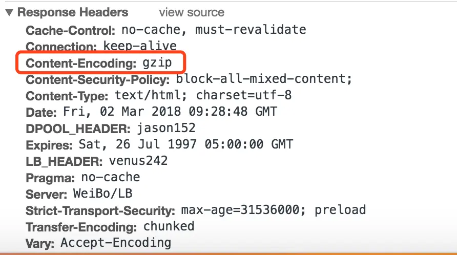 Content-Encoding:gzip // 当前内容压缩格式为gzip