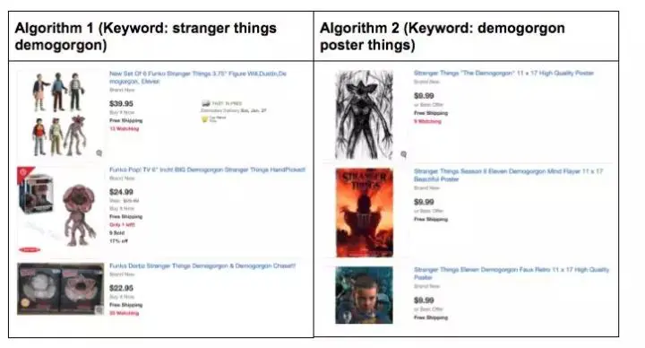 算法 1 展示了《怪奇物语》(Stranger Things)的纪念品,而算法 2 则展示了《怪奇物语》的魔王海报。这是因为算法 1 缺少“海报”关键词,这正是本文要讨论的内容。