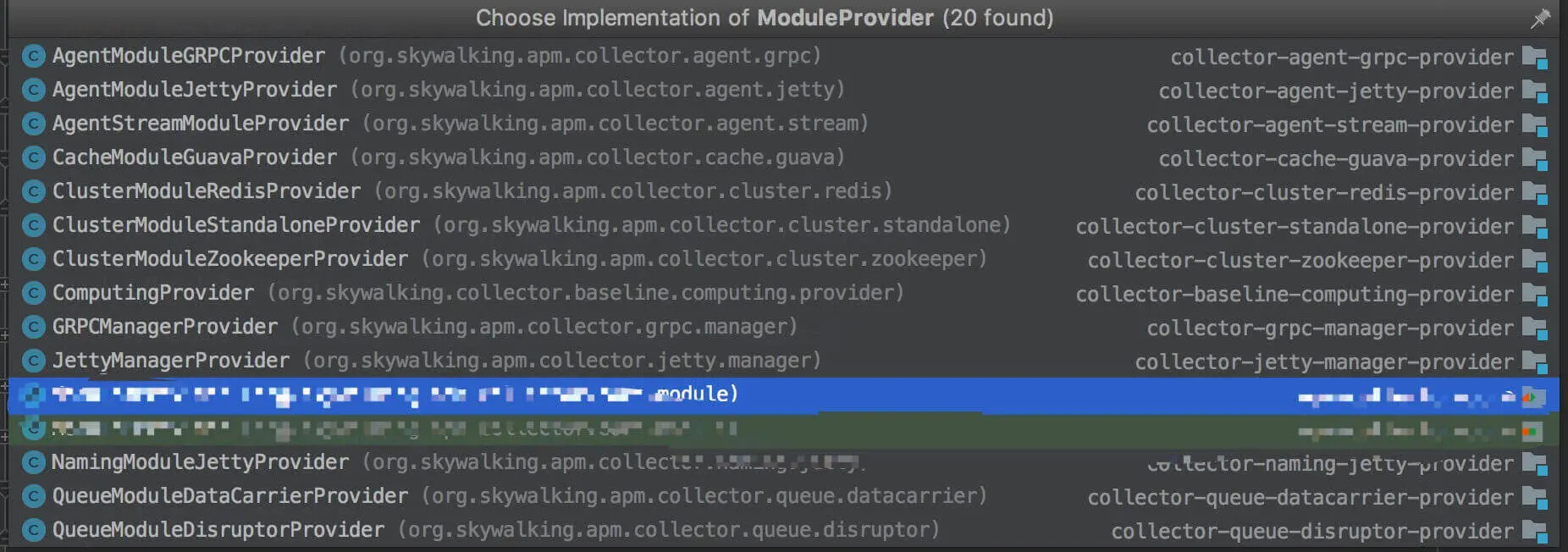 org.skywalking.apm.collector.core.module.ModuleProvider ,组件服务提供者抽象类。通过实现 ModuleProvider 抽象类,实现不同功能的组件服务提供者。目前 Collector 的 ModuleProvider 实现类如下图 :