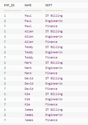 SELECT EMP_ID, NAME, DEPT FROM COMPANY CROSS JOIN DEPARTMENT;