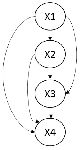 四个变量的全连通贝叶斯网络。这个模型中没有独立性,并且它是任何分布的 I-map。