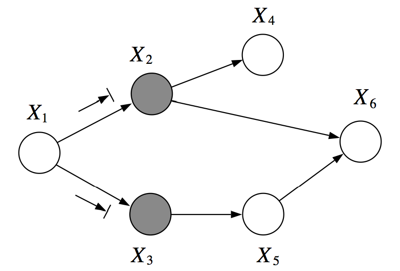 例如,在上面的图中,X1和X6在X2, X3条件下是 D-分离的。