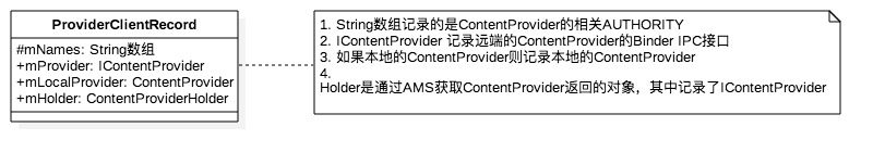 另外一个重要的则是ProviderClientRecord,用于在Client APP中缓存已经获得的ContentProvider信息(包括本地的ContentProvider)。在使用ContentProvider时,如果发现缓存中已经存在对应的ContentProvider信息,则不再向AMS请求获取ContentProvider接口,而是直接使用缓存中记录的IContentProvider接口。