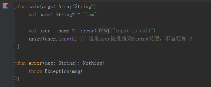 这里如果 error 函数的返回值不写明 Nothing 会被认为是 Unit ,user 的类型就会被推导为 Any ,因为 ?: 前后的类型不一致。
