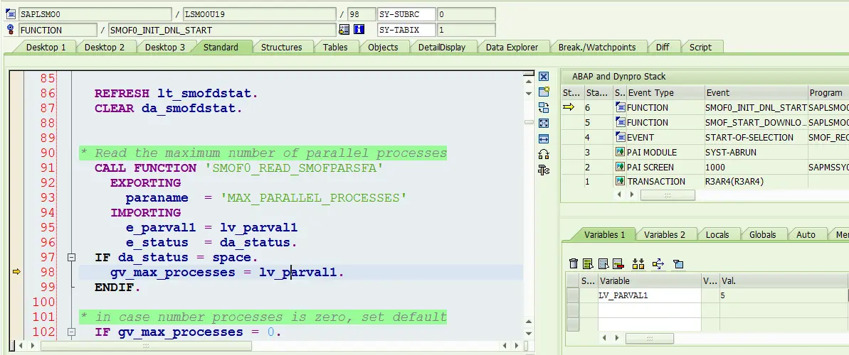 使用SMOF0_READ_SMOFPARSFA查询系统参数MAX_PARALLEL_PROCESSES,在我使用的系统上配置为5,意味着最大只允许有5个工作进程用于中间件下载。