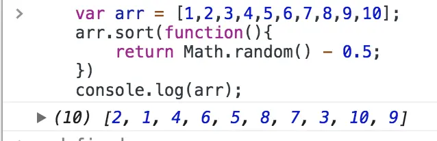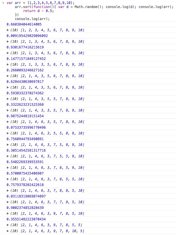 一开始这个数组是按照升序排列的,在比较函数里,当Math.random() > 0.5 的时候,当前的这个数和他后边的数不会互换位置,进行下一轮比较,以此类推,直到 Math.random() < 0.5 的时候,当前数和他后边的数互换位置,一共进行9次排列。