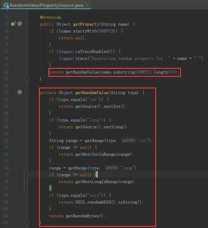 随机数的值是在Spring容器启动的过程中通过RandomValuePropertySource产生的,具体代码如下图。
