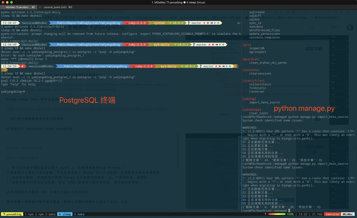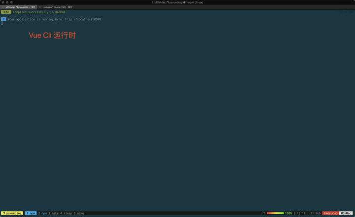 在终端执行 tmuxinator start yavueblog 就可以自动运行所有任务