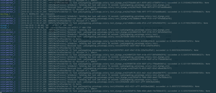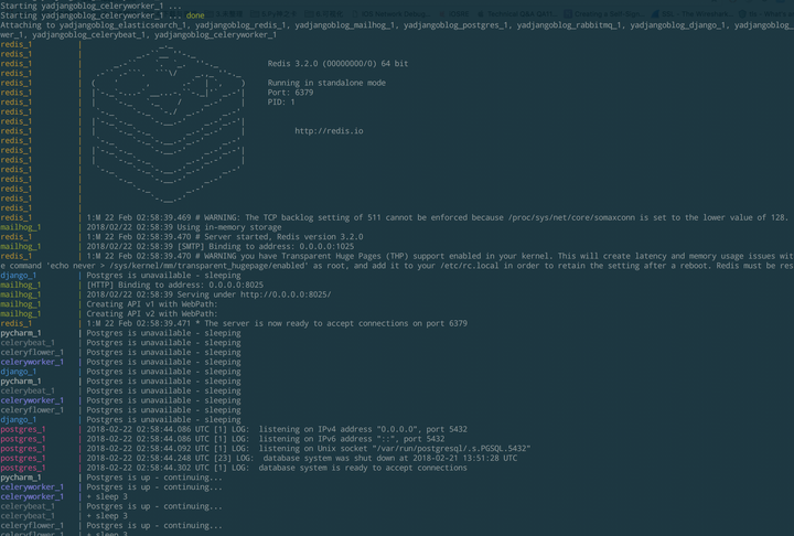 当我们运行 make django-just-up 这个命令的时候,所有服务运行的同时,所有的标准输入都打印到一个终端。