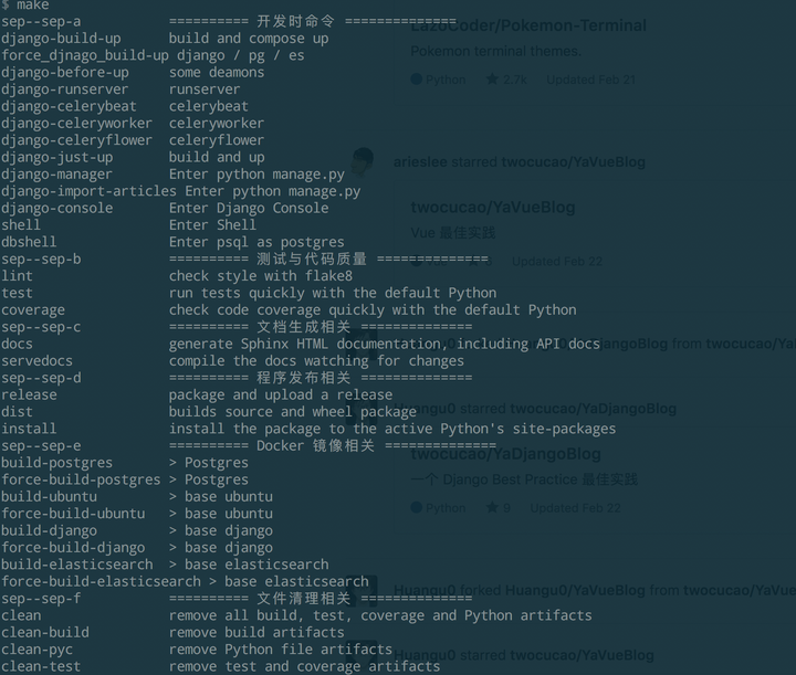 这是我用 Makefile 编写的一系列命令,方便我在开发过程将主要的精力花在业务逻辑上而不是花时间在强记大量的琐碎的命令。