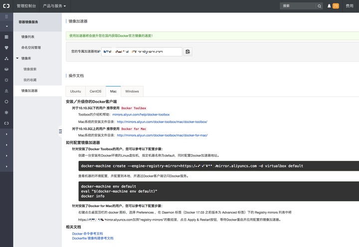 登录阿里云,到控制台,找到容器镜像服务,镜像加速器,