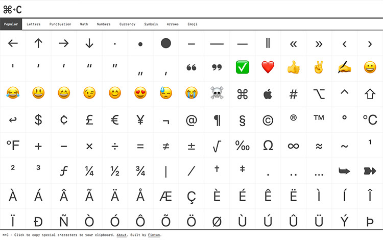 这个网站允许你查找和复制各种各样的特殊字符到剪贴板。字母,标点,数学符号,甚至表情,不一而足。