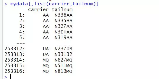 mydata[carrier %in% c("AA","AS"),.(carrier,tailnum)]