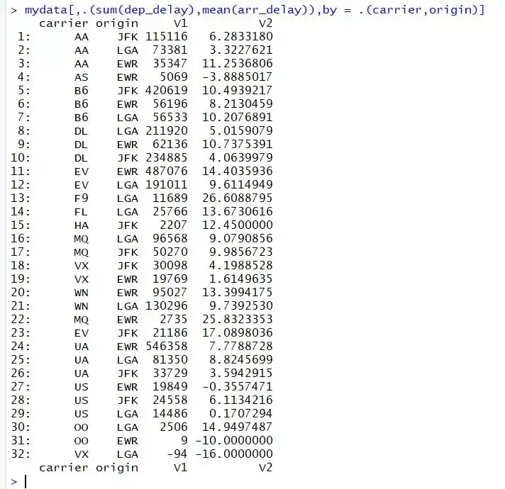 mydata[,.(sum(dep_delay),mean(arr_delay)),by = .(carrier,origin)]