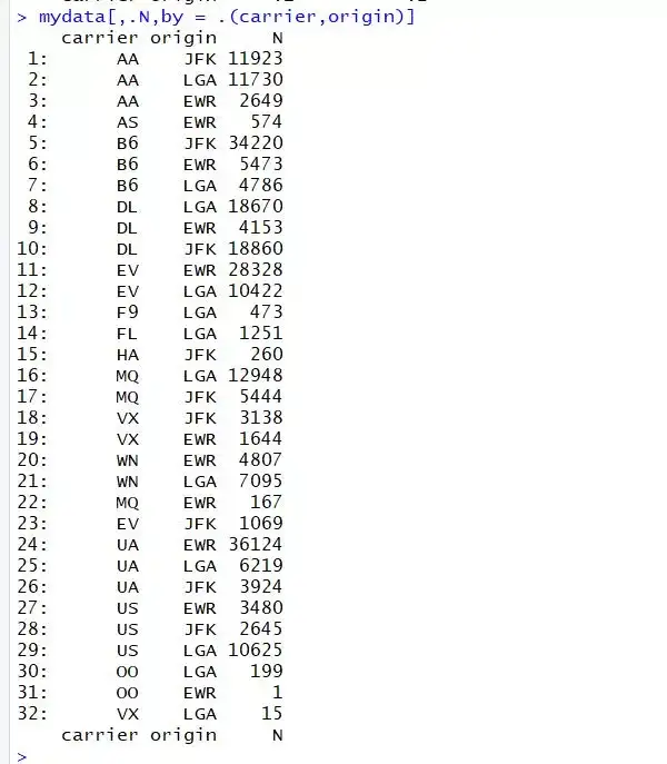 mydata[,.(carrier_n = .N),by = .(carrier,origin)]