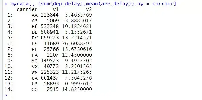 mydata[,.(dep_delay_sum = sum(dep_delay),arr_delay_mean = mean(arr_delay)),by = carrier]