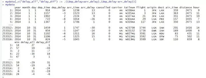 mydata[,`:=`(delay_all = dep_delay+arr_delay,delay_dif =dep_delay-arr_delay )]