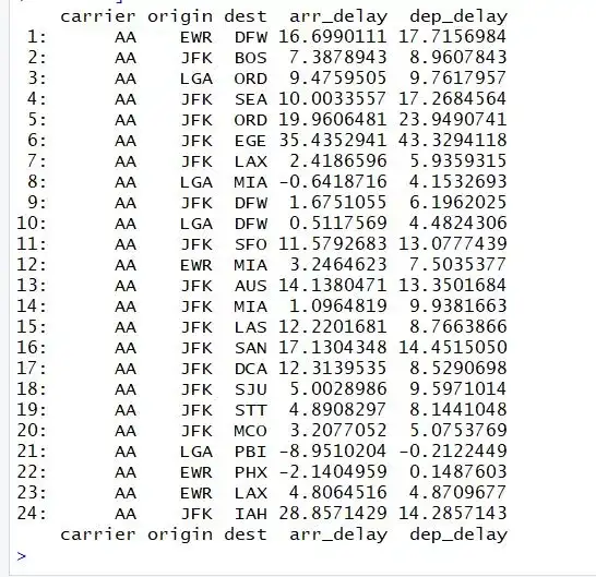 mydata[carrier %in% c("AA","AS"),.(dep_delay,mean(arr_delay))]