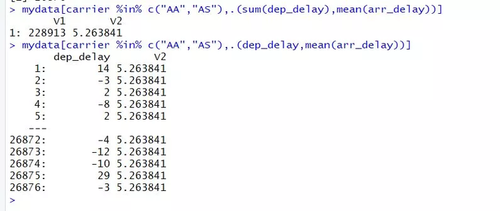 mydata[carrier %in% c("AA","AS"),.(sum(dep_delay),mean(arr_delay))]