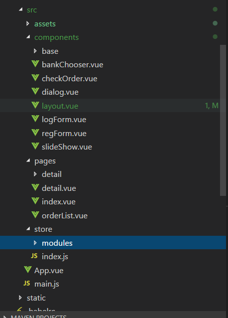 主界面分为上中下结构,header和footer相对简单直接在layout.vue中实现,中间的主体部分抽离为一个组件index.vue,主体部分又分为左右两个部分,左边为导航条,右上边为一个轮播组件,右下方是四个商品购买功能。