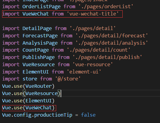 这里使用到了第三方npm包vue-wechat-title,安装好插件后需要在main.js导入插件如下图:
