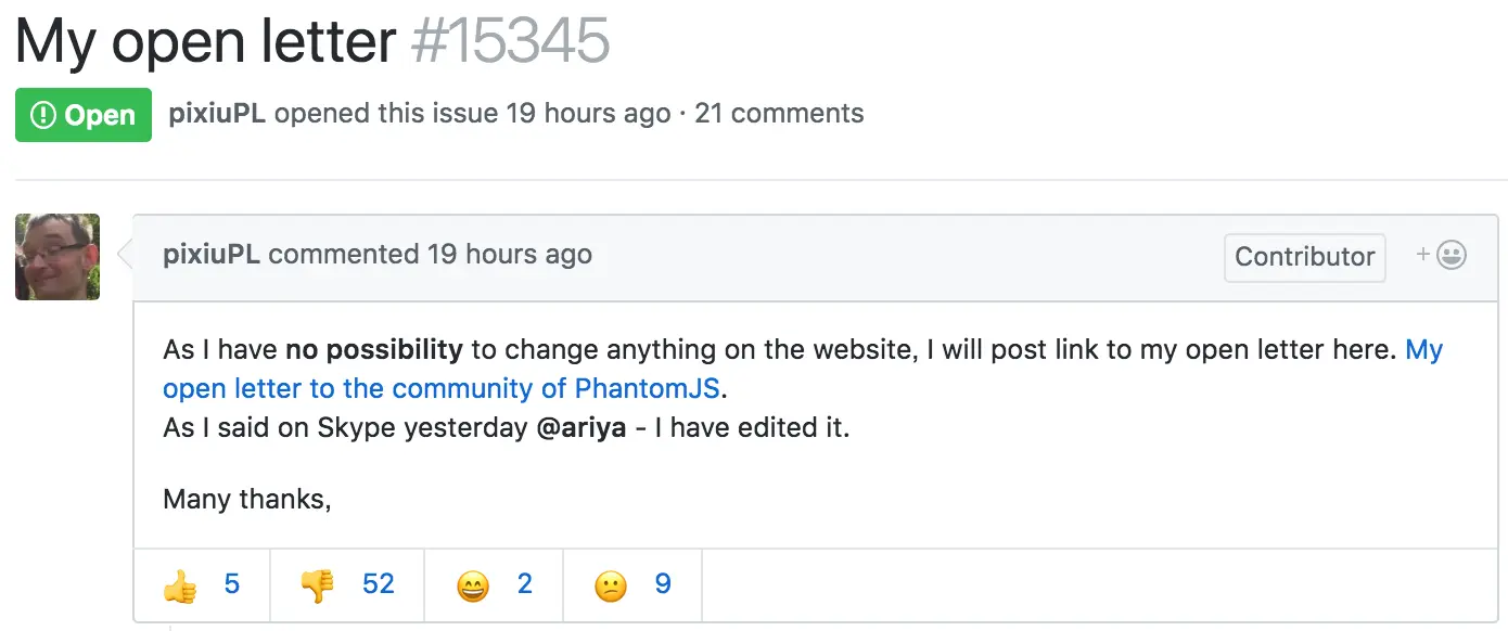 。PixiuPL 说自己在去年 11 月被 ariya 邀请成为 PhantomJS 项目在 Github 上的 Collaborator,随后开始深入研究 PJS 的源码,并进行 PR 合并、Issues 处理 、新版本发布等工作。近日,由于他在开发过程中遇到了需要访问项目设置权限的问题,随后在 Skype 和邮件上多次联系 ariya ,但均未得到回复(即使对方在线)。